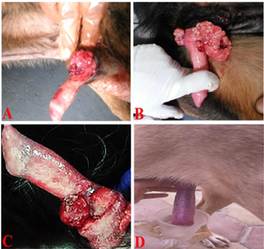 TVT and its response to vincristine therapy in male dogs. (A and B) showed an irregular, large, friable, reddish TVT mass (multinodular, cauliflower-like mass) overgrowth on the glans penis. (C) One-week post-treatment with the vincristine sulfate, the lesion presented an appreciable reduction. (D) By the end of the second week of vincristine therapy, the tumor mass had completely regressed.