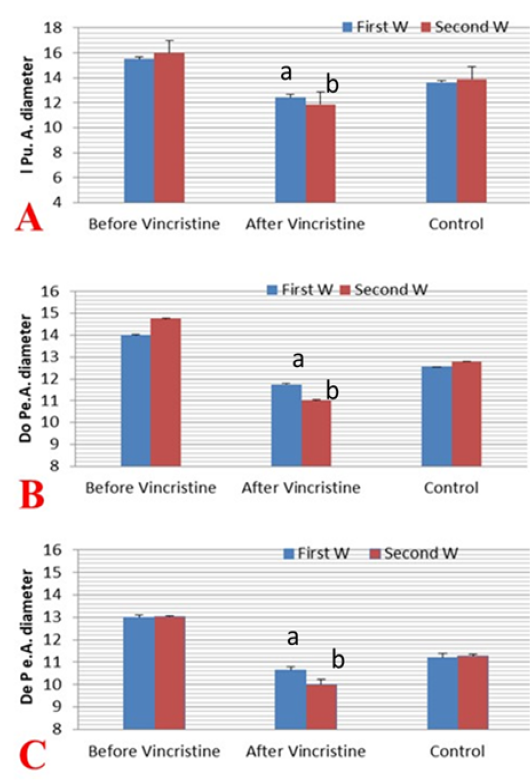 Mean ±SD internal pudendal artery (I Pu.A) (A), dorsal penile artery (Do Pe.A) (B), and deep penile artery (De Pe.A) (C) cross-sectional diameters (mm) during the first and second week before and after treatment by vincristine compared to control group.