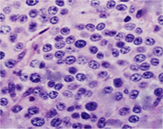Photomicrograph showing histopathological analysis of biopsies from infected TVT dogs (Gp II). The neoplastic cells were numerous, round to oval, of relatively uniform size with indistinct outlines growing in a scanty fibrous stroma. The cells had lightly eosinophilic granular cytoplasm and large, round to ovoid nuclei with prominent nucleoli. Mitotic figures were also plentiful (H&E, X400).
