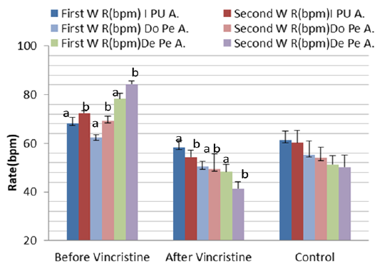 Mean ± SD internal pudendal artery (I Pu.A), dorsal penile artery (Do Pe.A), and deep penile artery (De Pe.A) blood flow rate (bpm) during the first and second week before and after treatment by vincristine compared to control group.