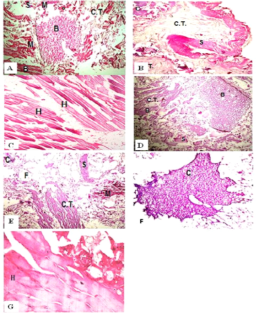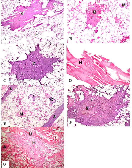H&E sections of luncheon sausages; A: D (premium luncheon); E: G (economic luncheon); M, muscle; F, fat; H, heart; B, bone; S, skin; C, cartilage