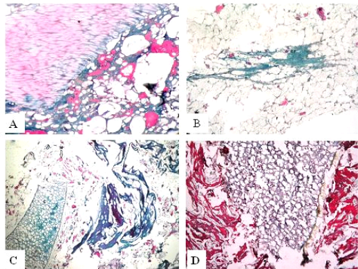 Trichrome sections of luncheon sausages and burger patties; A (premium luncheon); B (economic luncheon); C (premium burger patties); D (economic burger patties); muscle stained red; connective tissue stained green
