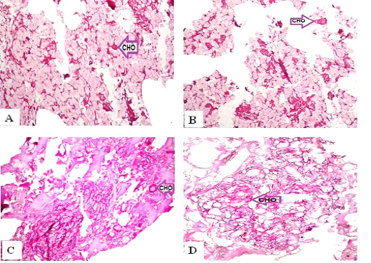 Periodic Acid-Schiff sections of luncheon sausages and burger patties; A (premium luncheon); B (economic luncheon); C (premium burger patties); D (economic burger patties); CHO, carbohydrates