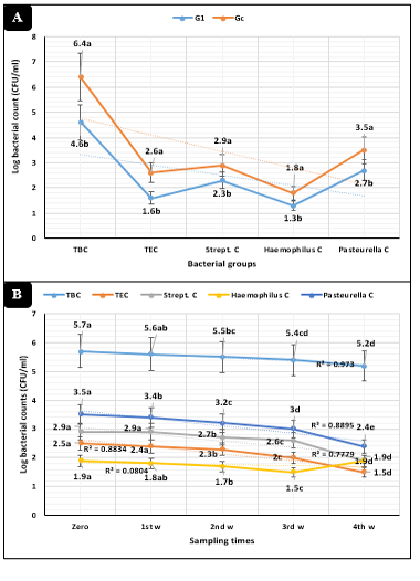 Bacteriological assessments (Mean ±SE) in dairy heifers exposed to cold stress. A) Concerning animal groups. B) Concerning sampling times. G1=Heifers injected with tulathromycin, Gc=Control, TBC=Total bacterial counts, TEC=Total Enterobacteriaceae counts, Strept. C=Streptococcus counts.