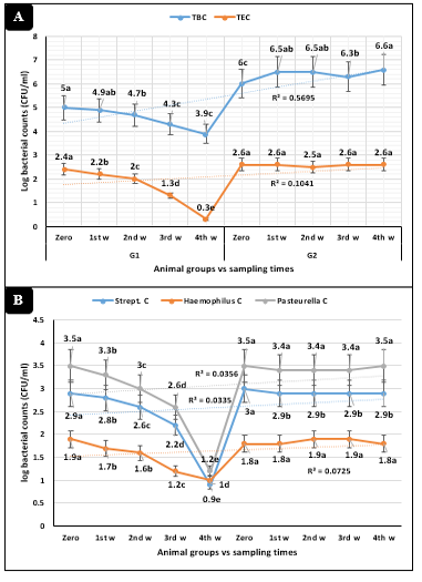 Microbiological parameters (Mean ±SE) in dairy heifers exposed to cold stress conditions concerning sampling times interactions. A) Total bacterial (TBC) and Enterobacteriaceae (TEC) counts. B) Streptococcus, Haemophilus, and Pasteurella counts.