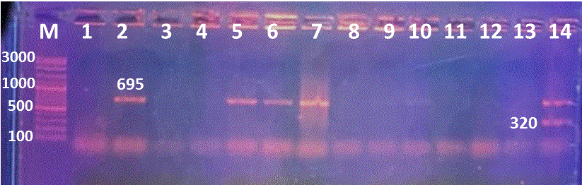 Multiplex PCR for mcr1 and blacmyІІ genes detection, Lane M:100-3000bpDNA marker; Lanes 2,5, 6 and 7 were positive blacmyІІ at 695bp, while Lane 14 positive mcr1 and blacmyІІ at 320, 695bp, respectively. Lanes 1,3, 4 and 8-13 are negative samples.