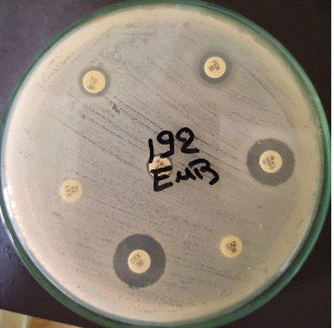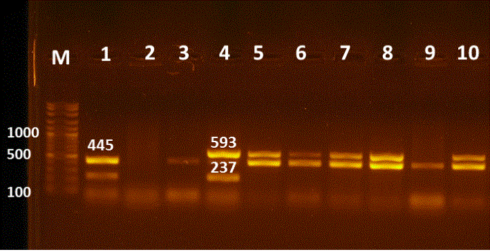 Multiplex PCR for detection of blaTEM, blaCTXM, blaSHV and blaOXA genes in E. coli isolates. Lane M:100-3000bpDNA marker; Lane 1 positive blaTEM& blaSHV at 445, 237bp, respectively; Lanes 3,9 positive blaTEM at 445bp; Lane 4 positive blaCTXM, blaSHV at 593, 237bp, respectively; Lanes 5-8&10 positive strains for blaTEM & blaCTXM at 445 and 593bp; Lane 2 negative sample.