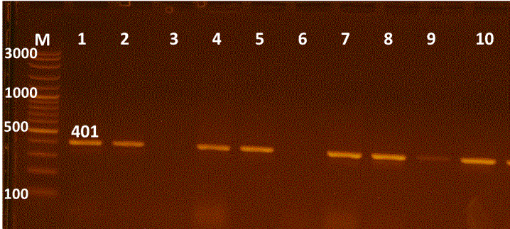Uniplex PCR for 16s rRNA detection of E. coli, Lane M:100-3000bpDNA marker; Lanes 1-10 were positive E. coli isolates.