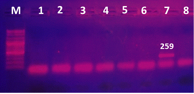 PCR for detection of rfbEO157 encoding gene. Lane M:100-3000bpDNA marker; Lane 1, 2: positive isolate for rfbEO157 gene; Lanes 3-7: negative strains.