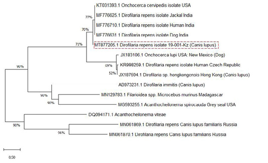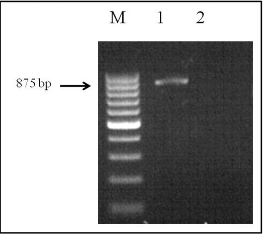 Electrophoretic analysis of PCR products: Lane M, DNA ladder (bp); lane 1, Dirofilaria spp. DNA; and lane 2, negative control.