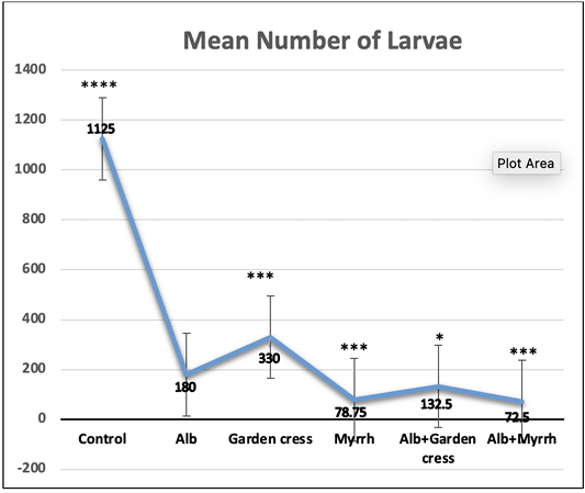 The larvae count recovered from control and experimental mice’s muscles on day 35 pi. The results are represented by the means±SE and Alb refers to Albendazole. All experimental groups are compared to Alb treated infected mic. ****P<0.0001; ***p<0.001; p<0.01; NS No significance.