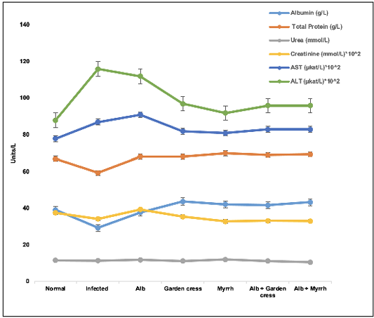 Liver and kidney proteins levels in the various treated groups on day 35 pi. The results are represented by the means±SE and Alb refers to Albendazole.