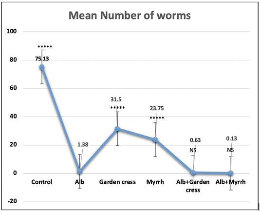 The worm count recovered from the intestines of control and experimental mice 7 days pi. The results are represented by the means±SE and Alb refers to Albendazole. All experimental groups are compared to Albendazole treated infected mic. ****P<0.0001; NS No significance.