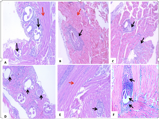 A section of skeletal muscle (red arrow) of a T. spiralis-infected mouse on the 35th-day pi (A) encysted larvae surrounded by intense inflammatory cellular infiltrate, which are indicated by black arrows. (B) treatment with Albendazole, showing Trichinella spiralis encysted larvae surrounded by intact capsules and severe inflammatory cellular infiltrate of mononuclear cells, mainly lymphocytes, and macrophages (black arrows). (C) treatment with Myrrh, showing a reduction in the number of larvae with degeneration of the larvae surrounded by mild inflammatory (black arrows). (D) treatment with Garden cress showing fragmentation and vacuolation of the larva with an invasion by inflammatory cells, mainly lymphocytes, and macrophages. Black arrows indicate vacuolated capsules. (E) combined Albendazole and Myrrh’s treatment showing a reduction in the number and a degeneration of the larvae, which were surrounded by mild inflammation (black arrows). (F) combined Albendazole and Garden cress treatment showing vacuolation of the nymph with intense invasion by the inflammatory cells consisting mainly of lymphocytes and macrophages (black arrows).