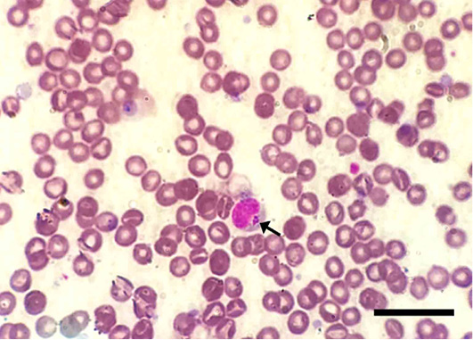 Ehrlichia canis inside a macrophage in Giemsa-stained blood smear of an infected dog. Note the multiple, relatively large-sized and round-shaped morulae intracellularly (arrows). Scale bar= 20 um.