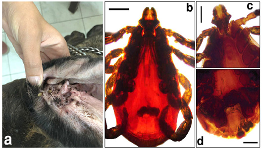 The adult brown tick, Rhipicephalus sanguineus, infesting the surveyed dogs. a) A dog ear infested with the tick vector. b) Doral view of the adult tick. c) Anteroventral view of the adult tick. d) Posterventral view of the adult tick. Scale bar= 0.5 mm.