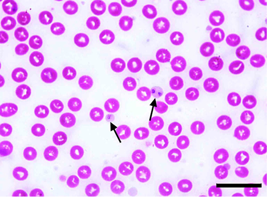 Anaplasma platys inclusion bodies in blood platelets (arrows) of Giemsa-stained blood smear of an infected dog. Scale bar= 20 um.