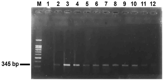 PCR amplification of DNA extracted from blood of surveyed dogs targeting the 16S rRNA gene using a primer specific for Anaplasma/Ehrlichia spp. Lane M: a ladder of 100 bp. Lanes 1,2 showed control negative and control positive respectively. Lanes 3–12 showed 10 blood samples positive for Anaplasma/Ehrlichia spp. with a product of an amplicon size 345 bp.