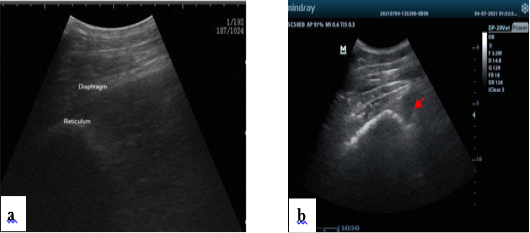 Normal ultrasonogram of the reticulum, notice half-moon shape (a). Presence of hypoechogenic fluid notice fibrin thread “arrow” in the reticular area in some diseased conditions (b).