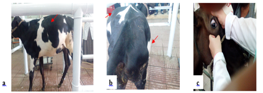 Notice distension of left side of the abdomen (a), Bilateral distension of the abdomen with left ventral and dorsal distension and right ventral distension (apple/pear) (b). Congested eye capillaries and sunken eye (c).