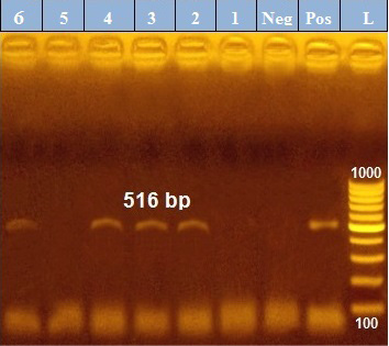 PCR amplification of the 516 bp fragment of blaTEM resistance gene from 6 P. aeruginosa isolates (1-6), Pos. (control positive), Neg. (control negative).