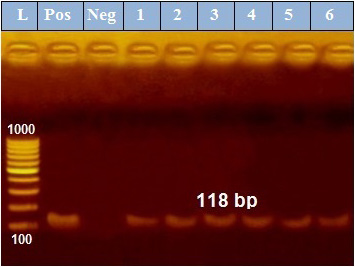 PCR amplification of the 118 bp fragment of exoS resistance gene from 6 P. aeruginosa isolates (1-6), Pos. (control positive), Neg. (control negative).