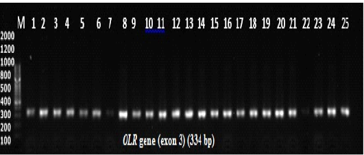 Agarose gel electrophoresis for PCR products amplification of the OLR1 gene. Lane M: 100 bp DNA ladder, lanes 1-12 indicate samples of ewes with single birth, lanes 13-25 indicate samples of ewes with twin birth. Electrophoresis conditions: 1.5% agarose concentration, Electrophoresis time 25 minutes. The buffer used TBE pH 8.3.