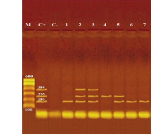 Agarose gel electrophoresis of multiplex PCR of stx1 (180 bp), stx2 (255 bp) and eaeA (384 bp) virulence genes for characterization of pathogenic E. coli isolated from examined local and imported meat samples