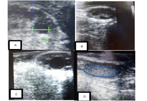 Ultrasound images of a cow’s ovaries in this study. (A) This image shows to get diameter of follicle or corpus luteum, (B) these images show five follicles, (C) these images show one dominant follicle, and (D) these images show of corpus luteum.