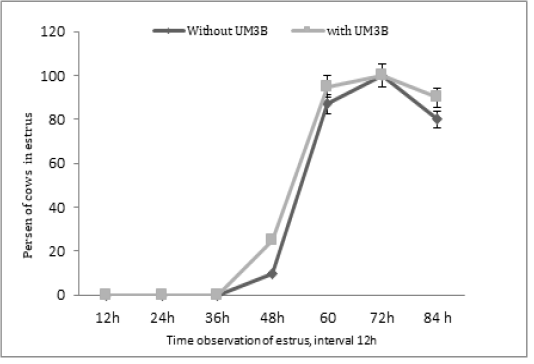 Percentage of estrus response after second injection of PGF2α in cows observed at 12h intervals (with UM3B or without UM3B).