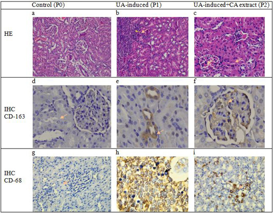 Cross-section of glomerulus and tubulointerstitial of rats showed no change in the structure of the epithelial and mesangium in the control group (a). However, there were severe infiltration cell, vacuolar degeneration, and necrotic epithelium in the area of glomerulus and interstitial tubules on induction group (b) meanwhile decrease the number of inflammation and alteration epithelial cells were observed in the histopathological cross-section of the renal tissue of rats in the group that received Coleus amboinicus. (c). No specific expression of macrophage CD-68 nor positive cells of macrophage CD-163 in the control group (a.d.) Expression of macrophage CD-163 positive cells is observed in interstitial and tubules (e) but decreased numbers of CD-163 expressions in the group with received CA extract (f). Meanwhile, the expression of macrophage CD-68 is also observed an increase in the area epithelial tubularcells in the treatment group (h) and decreased number of positive cells in the group with Coleus amboinicus extract (i) (40 x; IHC, counterstained hematoxylin).