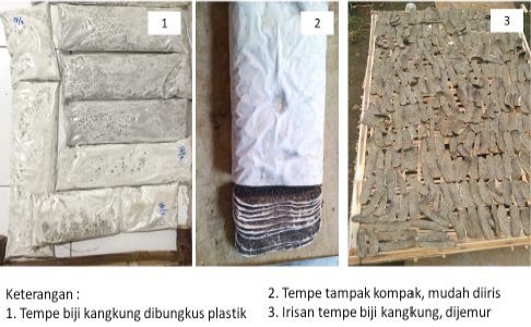 Kangkong seed tempeh (1) Kangkong seed tempeh was wrapped in transparant plastic in cuboid shape; (2) Tempeh were compact and easily to sliced.