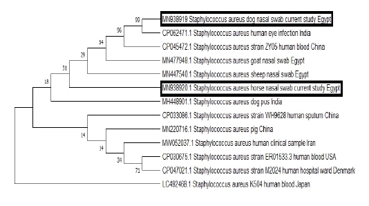 The phylogenetic bootstrap consensus tree demonstrated the evolutionary history of the mecA gene sequences; 2 from the current study and others retrieved from GenBank from human and animal origin. The analysis was conducted using neighbor-joining approach with Mega7 software.