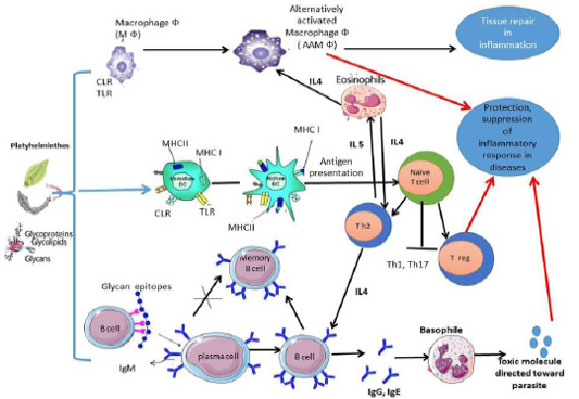 Anti-inflammatory and regulatory immune response was elicited by platyhelminths glycans and glycoconjugates.