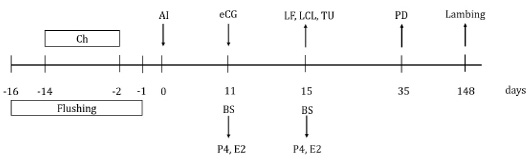 Schematic diagram of equine chorionic gonadotropin (eCG) treatment after insemination in Creole ewes. Ch=20 mg chronolone in intravaginal sponge; AI=artificial insemination; eCG=application of 330 IU of equine chorionic gonadotropin to the group of ewes that received eCG; BS=blood sample; P4=progesterone concentration; E2=estradiol concentration; LF=large follicles evaluation; LCL=large corpus luteum evaluation; TU=turgid uterus evaluation; PD=pregnancy diagnosis.