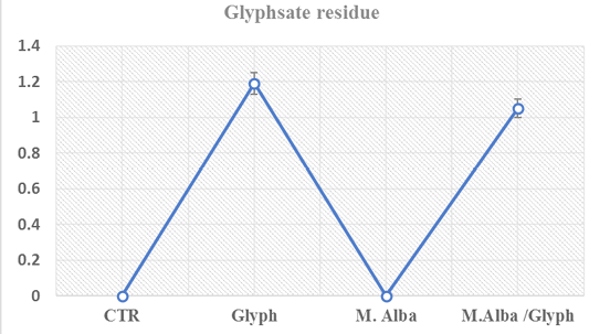 Glyphosate concentrations in fish muscle (µg/kg) showed no significant changes among intoxicated group with glyph and treated intoxicated group (glyph/M. albus) at twenty-one day in cat fish