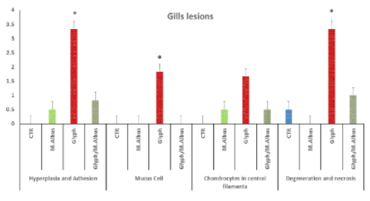 Showing that the gills of fish intoxicated with glyphosate have enhanced hyperplesia and adhesion of gill filaments, mucus cell, chondrocytes proliferation in centeral filaments and degeneration and necrosis of gill filaments, while these lesions were dissppeared from CTR and other treated group and improved in treated group with (Glyh+M. albus). Data expressed as Mean ± SE, analyzed using one-way ANOVA at P≤0.05, column with (*) indicate significant difference among the values of different groups. (C=Control, G=glyph, M=M. albus, T=(Glyph/M. albus).