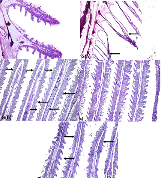 C: Fish gills showing gills with normal primary and secondary gill filament with normal cellular structure and central blood supply of gill filaments (H and EX100) G (a):Gills fish showing necrosis and degeneration of all epithelial cells covering gill filaments (gill filaments appeared bar from all cells) (arrows)(H and EX4) G(b): some parts of gills showing inter lamellar hyperplasia ,inflammatory infiltration of mononuclear cells ( long thick arrows) in gill filaments with mucus cells proliferation (long thin arrows) and chondrocytes proliferation in the center of gill filaments (short thin arrow) with lamellar fusion of gill secondary filaments in the upper part (thick short arrow) (StainH and EX100) M gills: showing highly intact healthy gill filaments with normal secondary non fused gill filament with central blood supply (H and EX100) T: gills showing improved gill filaments structure (long arrow) with still presence of gill necrosis (short arrows) (H and EX100).