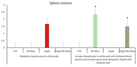 C showing that the spleen of fish intoxicated with glyphosate have enhanced depletion of lymphocytes in white pulb, but the increase lymphocytes in white pulp with dilated blood vessels and increase in periarterial lymphatic sheath were recorded in mullberry group,and treated group. Data expressed as Mean ± SE, analyzed using one-way ANOVA at P≤0.05, column with (*) indicate significant difference among the values of different groups. (C=Control, G=glyph, M=M. albus, T=(Glyph/M. albus).