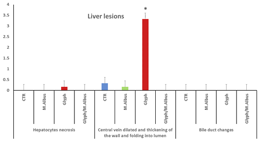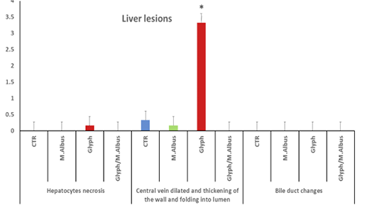 Showing that liver of fish intoxicated with glyphosate have hepatocytes necrosis, central vein dialtation and thickening of the wall and folding in lumen and no changes in bile duct were recorded, while these lesions were dissppeared from CTR and other treated group and improved in treated group with (Glyh+M. albus). Data expressed as Mean ± SE, analyzed using one-way ANOVA at P≤0.05, column with (*) indicate significant difference among the values of different groups. (C=Control, G=glyph, M=M. albus, T= (Glyph/M. albus).