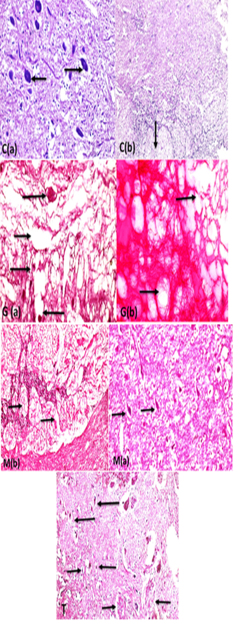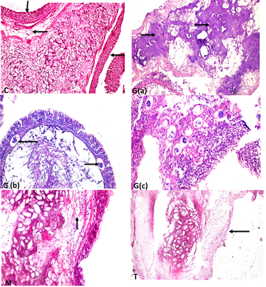 C: labyrinth organ showing central elastic cartilage in the center with normal maize like structure epithelium tissues in the periphery (short arrow) and normal blood capillaries (long arrow) (StainH and EX200). G(a) labyrinth organ of fish showing conversion of elastic cartilage into fibrocartilage (arrows) (H and EX400). G(b) labyrinth organ with thrombosis (arrows) of blood capillaries (H and EX200) (StainH and EX100 ). G(c) high power of previous picture showing thrombosis of blood capillaries (H and Ex400). M :elastic cartilage normal with maize like epithelium structure in the periphery and healthy blood supply (arrow)(H and EX400)T: showing intact elastic cartilage with few some degenerative changes and degeneration of epithelial cell in maize like structure in the periphery(long arrow) (H and EX200).