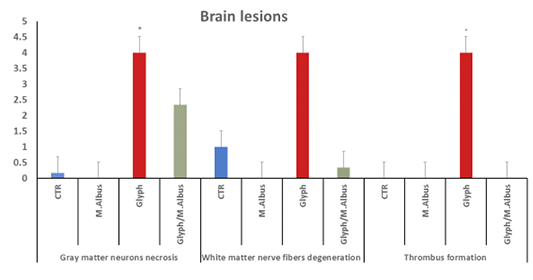 Showing that the brain of intoxicated fish with glyphosate have enhanced gray matter neurons necrosis, white matter nerve fiber degeneration and thrombus formation, while these lesions were dissppeared from CTR and other treated group and improved in treated group with (Glyh+M.albus). Data expressed as Mean ± SE, analyzed using one-way ANOVA at P≤0.05, column with (*) indicate significant difference among the values of different groups. (C=Control, G=glyph, M=M. albus, T=(Glyph/M. albus).