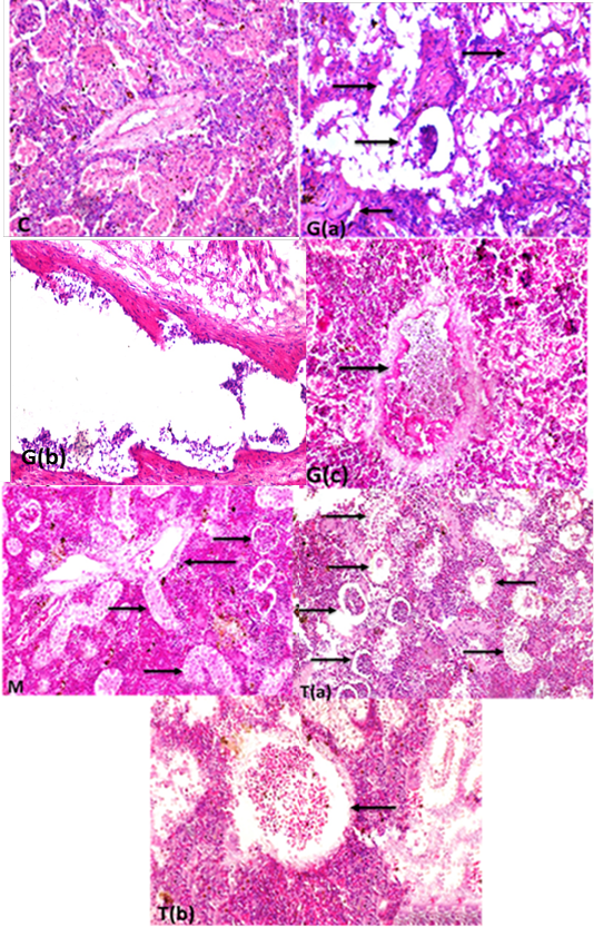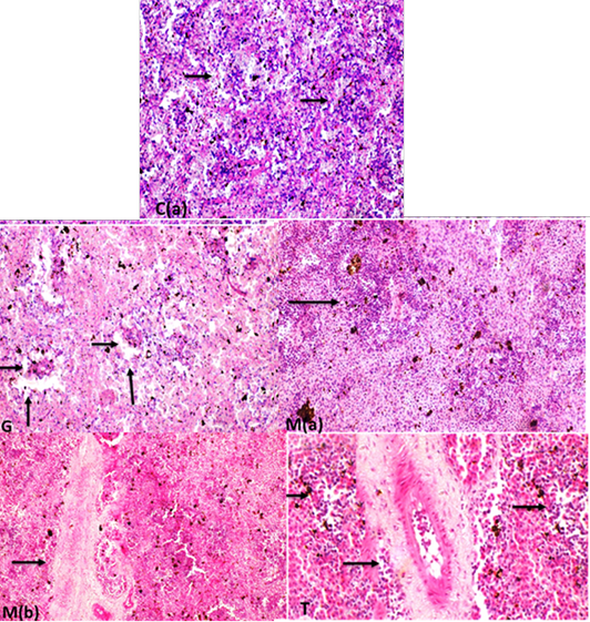C(a): spleen white pulp impacted with lymphocytes (arrows)(H and EX200). C(b): Spleen fish showing normal diameter central arteriole (H and EX400) G: spleen fish revealing depletion of lymphocytes in white pulp ( long arrows) with normal diameter central arteriole (short arrows) (H and EX200) M(a): increase lymphocytes in white pulp (arrow)(H and EX400) M(b ):high increase in periarterial lymphatic sheath (arrow) (H and Ex200). T: increase lymphocytes in white pulp with dilated blood vessels and increase periarterial lymphatic sheath.