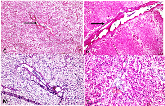 (c) kidney showing glomeruli with normal kidney tubular epithelium and normal circumscribed wall thickness of blood vessel(H and EX400).G (a): Kidney fish intoxicated with glyphosate showing atrophied renal glomeruli (long thin arrow) degeneration and necrosis of renal tubular epithelium (short arrows) and interstitial fibrosis (thick long arrow),(H and EX400) G(b) blood vessels in kidneys showing folding of all wall tunics into the lumen with severe thickening in the wall of blood vessels folding into lumen (H and EX400) ,G(c) kidneys showing thrombosis in the lumen of renal blood vessel attached to the wall with accumulated RBCs and leukocytes (H and EX400) M: Kidney fish showing healthy glomeruli (long thick arrow) , and highly improved renal tubular epithelium (long thin arrows) with normal blood vessels wall (short thick arrow) (H and EX200) T(a):kidneys fish showing high intact renal glomeruli (long thick arrow), and normal renal tubular epithelium of renal tubuli (long thin arrow) but still present of degree of degenerative changes of some renal tubules (short thick arrow)(H and Ex200) T(b): renal blood vessels with normal circumscribed vessels wall with normal thickness and normal blood content (arrow)(H and EX400) H and E semi quantitative scoring of hepatic lesions.