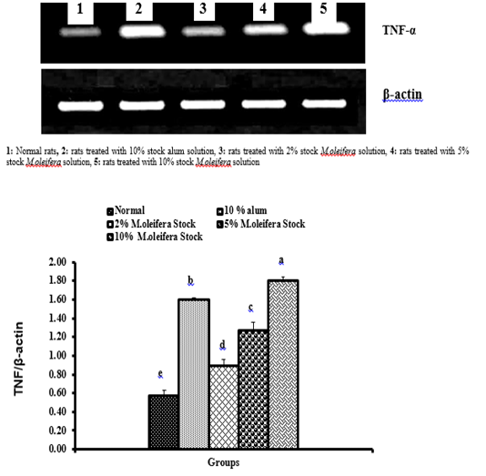 Effects of alum and M. oliefera seed aqueous extract on liver TNF-α mRNA expression relative to β-actin of albino rats