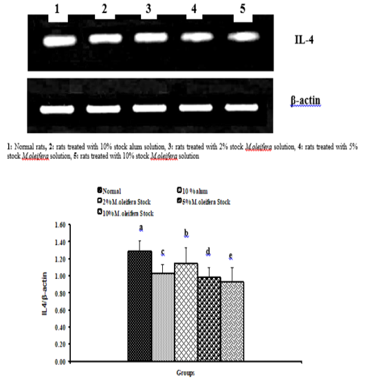 Effects of alum and M. Oliefera seed aqueous extract on liver IL-4 mRNA expression relative to β-actin of albino rats
