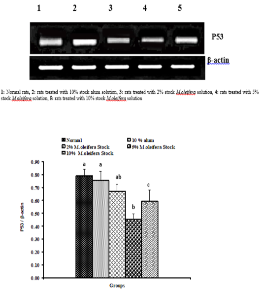 Effects of alum and M. Oliefera seed aqueous extract on liver P53 mRNA expression relative to β-actin of albino rats