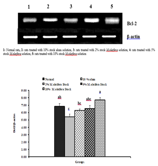 Effects of alum and M. Oliefera seed aqueous extract on liver Bcl-2 mRNA expression relative to β-actin of albino rats