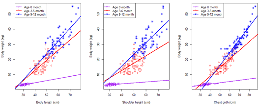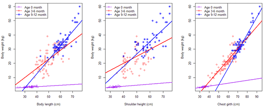 Scatter plot and regression line between body weight and body measurements of male Saburai goats at three different age group.