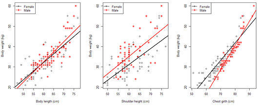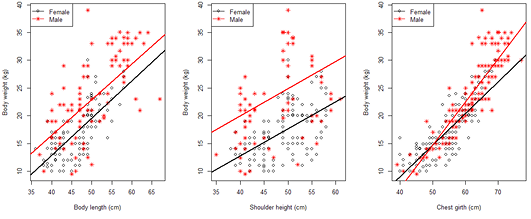 Scatter plot and regression line between body weight and body measurements of female and male Saburai goats at age 9-12 month.
